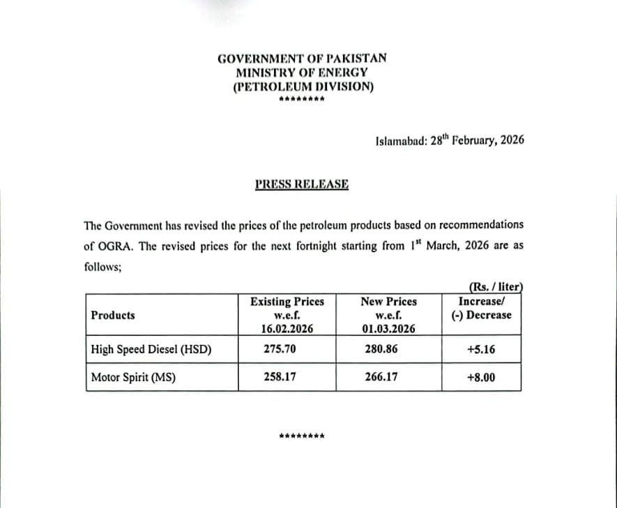 حکومت نے آئندہ 15 روز کے لیے پیٹرولیم مصنوعات کی قیمتوں میں اضافہ کردیا۔ پیٹرولیم ڈویژن نے...