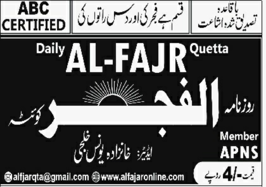 اخبار Daily Al Fajr Quetta 21-04-2026 alfajaronline اپریل 21, 2026 ALFAJR 21-04-2026Download Post navigation Previous معاہدہ نہ ہونے کی صورت میں جنگ یقینی’ ہے ٹرمپ جواب دیں جواب منسوخ کریںآپ کا ای میل ایڈریس شائع نہیں کیا جائے گا۔ ضروری خانوں کو * سے نشان زد کیا گیا ہےتبصرہ * نام * ای میل * ویب سائٹ اس براؤزر میں میرا نام، ای میل، اور ویب سائٹ محفوظ رکھیں اگلی بار جب میں تبصرہ کرنے کےلیے۔ Related Stories روزنامہ الفجر بروز پیر 20 اپریل 2026 اخبار روزنامہ الفجر بروز پیر 20 اپریل 2026 اپریل 20, 2026 وزیراعظم شہباز شریف کا صدرِ اسلامی جمہوریہ ایران سے ٹیلیفونک رابطہ اخبار بین الاقوامی سیاست نیوز بیٹ وزیراعظم شہباز شریف کا صدرِ اسلامی جمہوریہ ایران سے ٹیلیفونک رابطہ اپریل 20, 2026 قربانی کی ایک نئی مثال قائم کرتے ہوئے پہلی خاتون پولیس کانسٹیبل ملک ناز نے وطنِ عزیز پر اپنی جان نچھاور کر دی۔میر سرفراز بگٹی News Flash اخبار سیاست کرائم نیوز بیٹ قربانی کی ایک نئی مثال قائم کرتے ہوئے پہلی خاتون پولیس کانسٹیبل ملک ناز نے وطنِ عزیز پر اپنی جان نچھاور کر دی۔میر سرفراز بگٹی اپریل 20, 2026